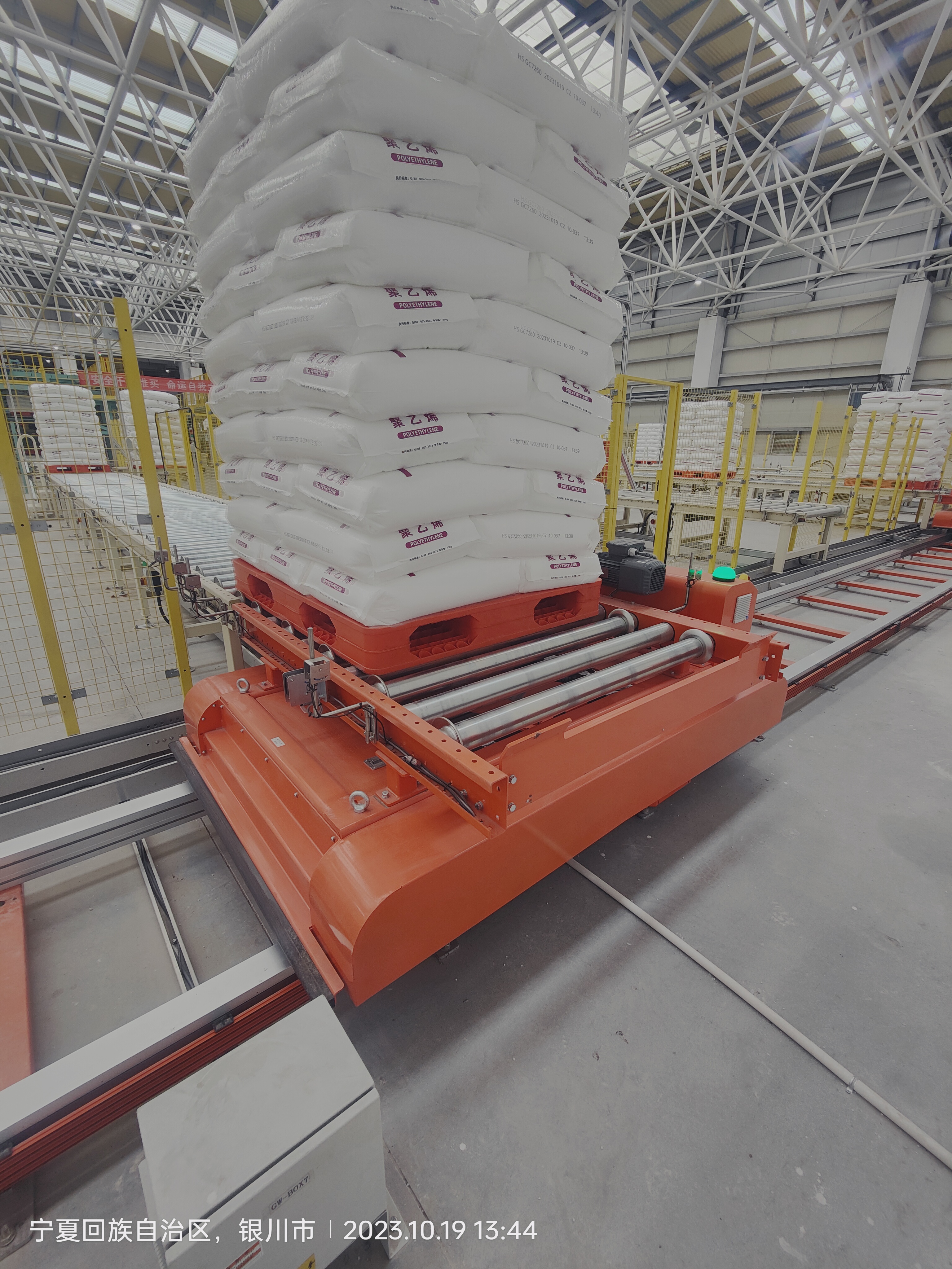 输送设备以链条机、辊筒机和移载机为主力,覆盖产线对接、火车发货、汽车发货三大核心区域,设备承载可达1.6吨,完美适配吨包物料的重载输送需求。其中,鸿安重载环形穿梭车成为系统高效运转的“心脏”,其行走速度达160米/分钟,加速度0.5m/s²,北库部署的34台环穿设备依托970米轨道形成闭环,南库24台环穿设备沿752米轨道运行,强大的调度能力保障了高流量物料的顺畅流转。