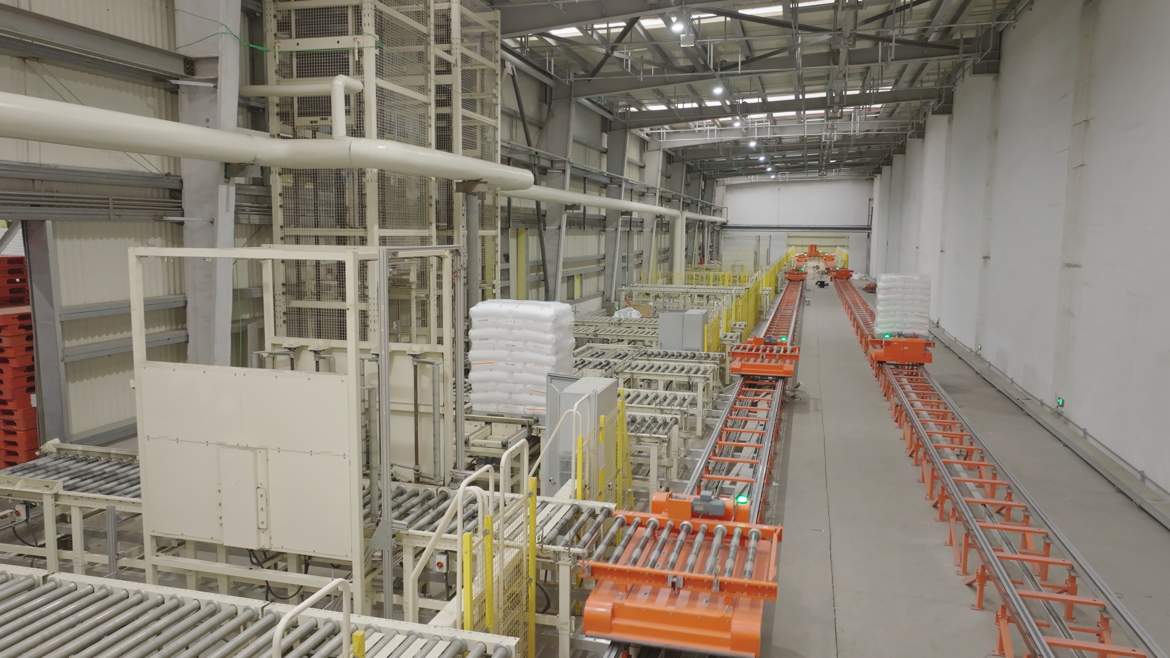 据鸿安项目规划工程师介绍,该项目仓储系统分为南库与北库两大核心区域,分工明确且任务繁重:南库专注存储PP物料,需对接5条产线;北库负责EVA和HDPE物料存储,对接7条产线。两大仓库均需覆盖成品下线入库、空托盘补给、成品立库存储、汽车发货、火车发货全流程,其中南库与北库需满足每小时400余托的综合流转需求。